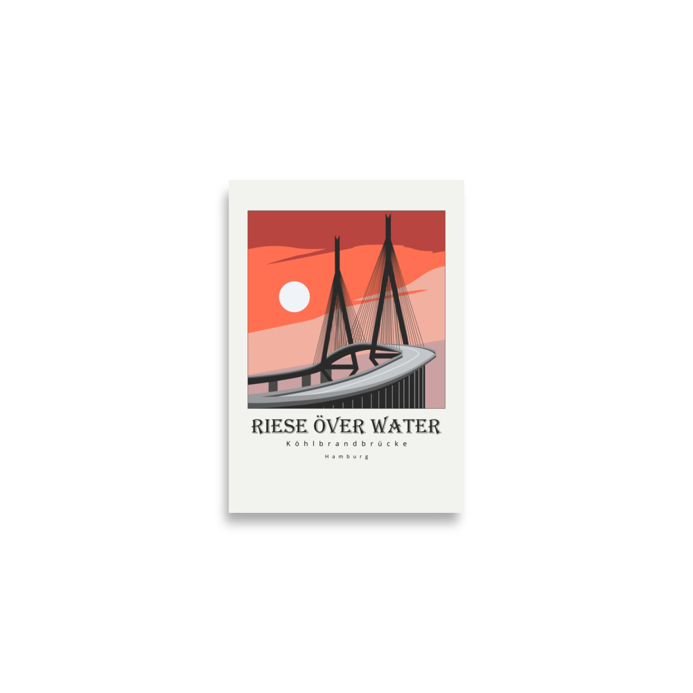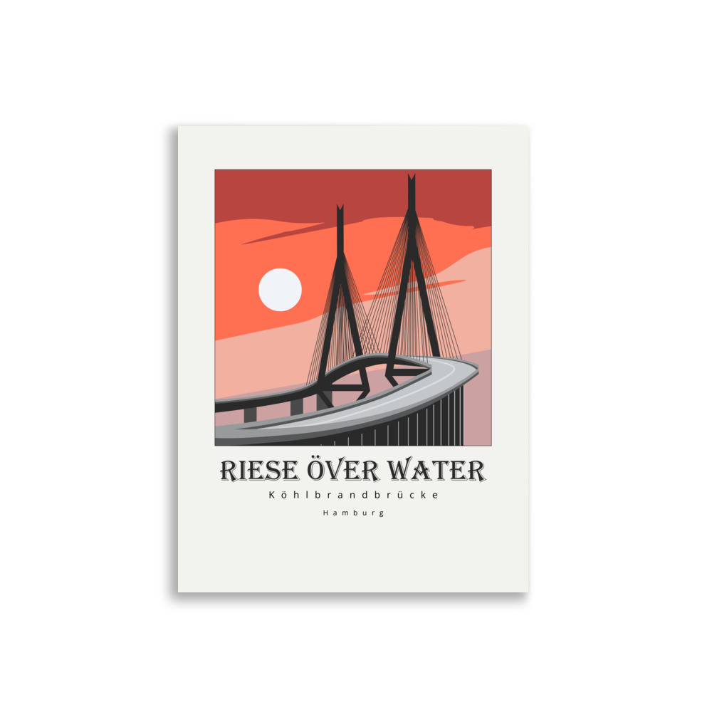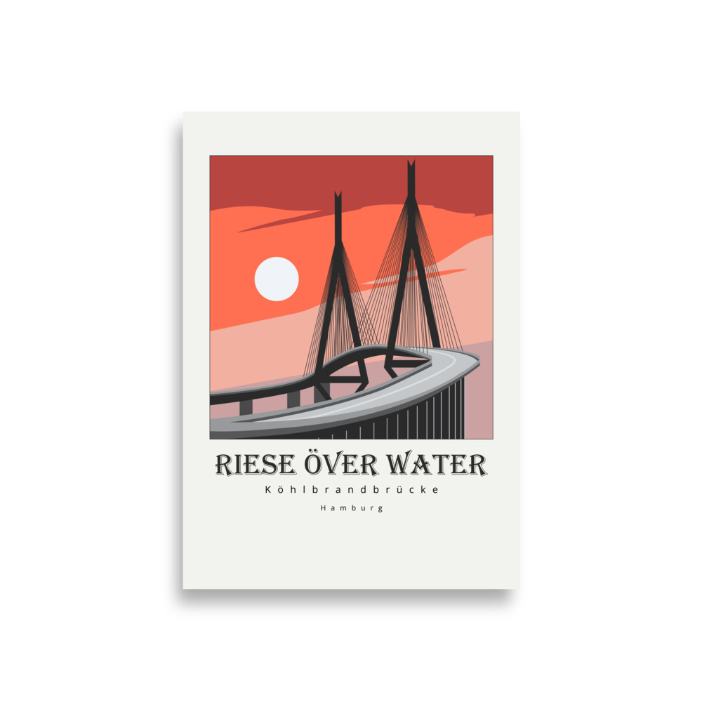 Stolz, stark und nicht zu übersehen: die Köhlbrandbrücke ist Hamburgs stiller Riese über dem Hafen. Der Spruch „Riese över Water“ heißt „Riese überm Wasser“ – und genau das ist sie! Als eines der markantesten Wahrzeichen des Hamburger Hafens trägt sie seit ihrer Erbauung 1974 den Verkehr über die Elbe und verbindet den Hafen mit der Stadt. „Köhlbrandbrücke Hamburg Poster“ fängt diese beeindruckende Silhouette ein: die mächtigen Bögen, die klaren Linien und die ruhige Eleganz, die sie trotz ihrer Größe ausstrahlt.