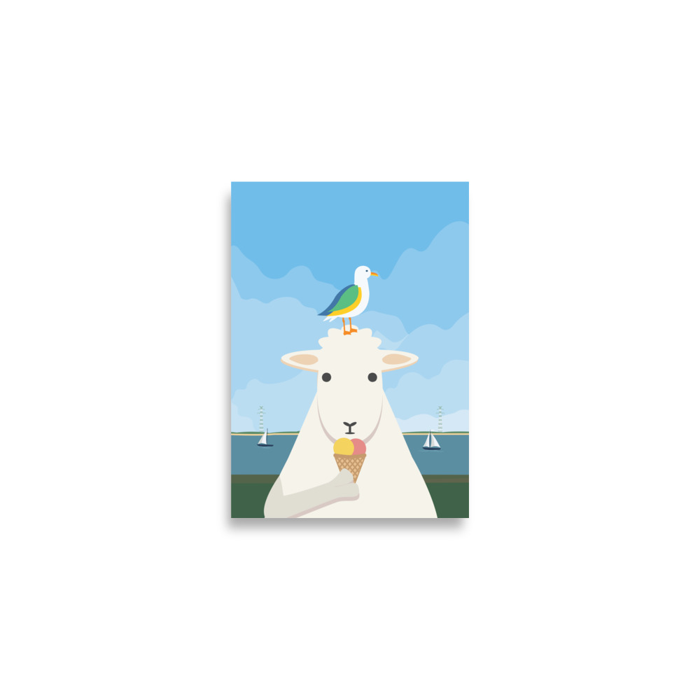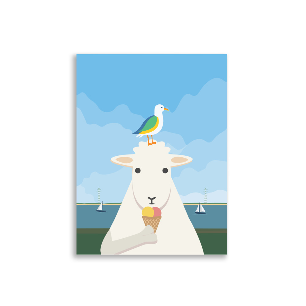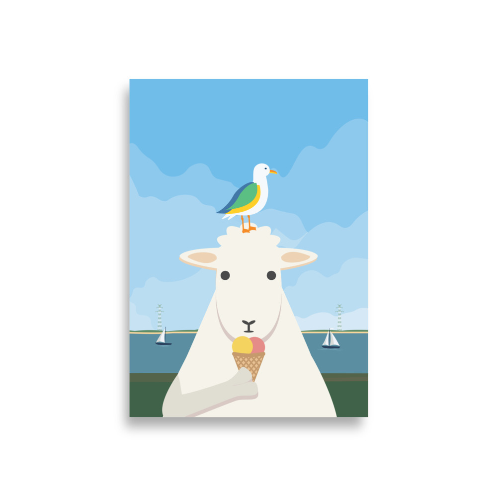 Poster Schaf Möwe: ideal für alle, die norddeutschen Humor lieben, maritime Szenen schätzen oder einfach ein charmantes Bild suchen, das entspannt und Freude bringt. Es vermittelt das Gefühl von Sommer am Wasser und die Lust auf ein Eis bei frischer Brise.