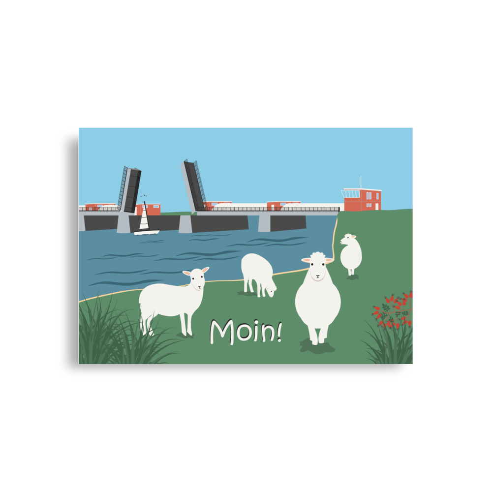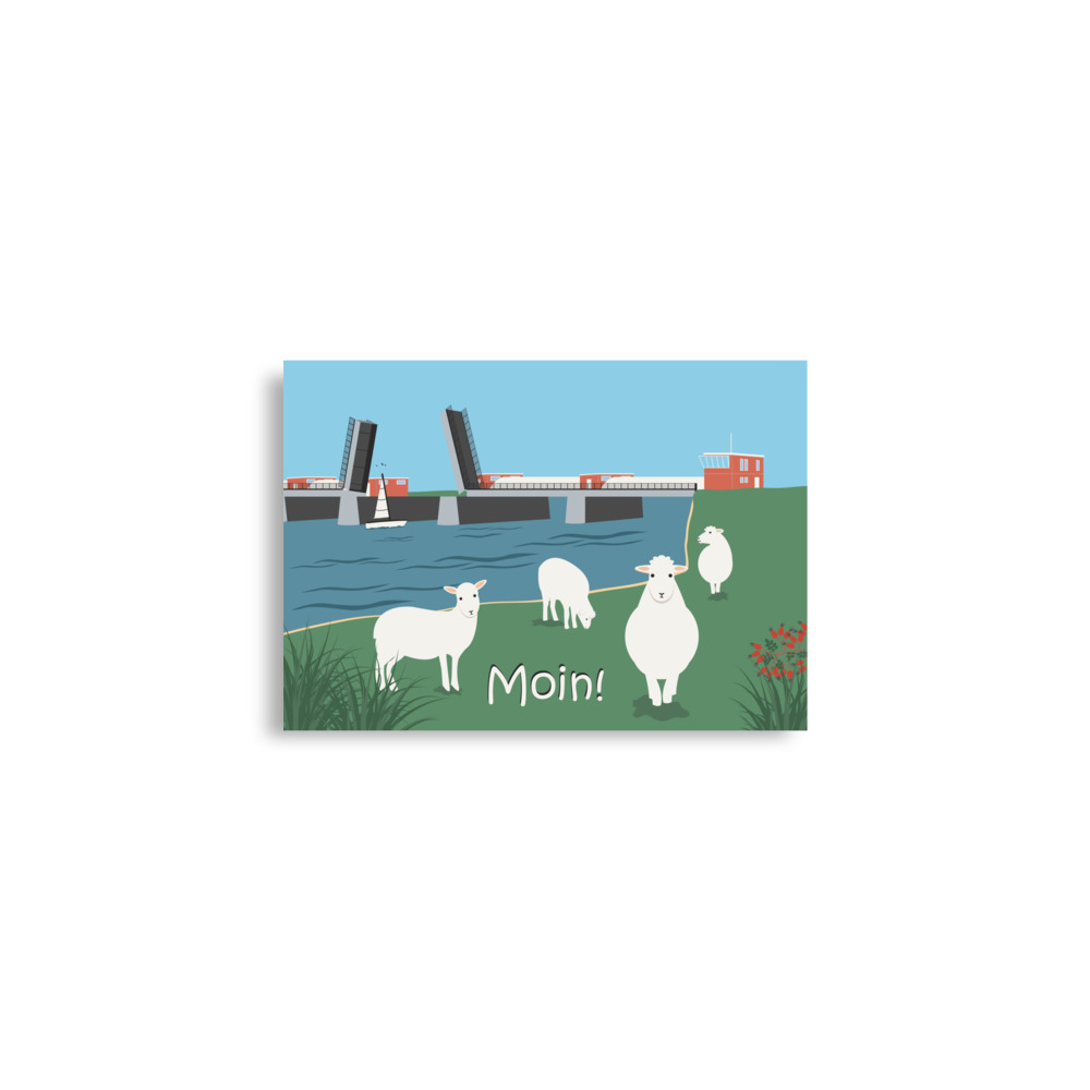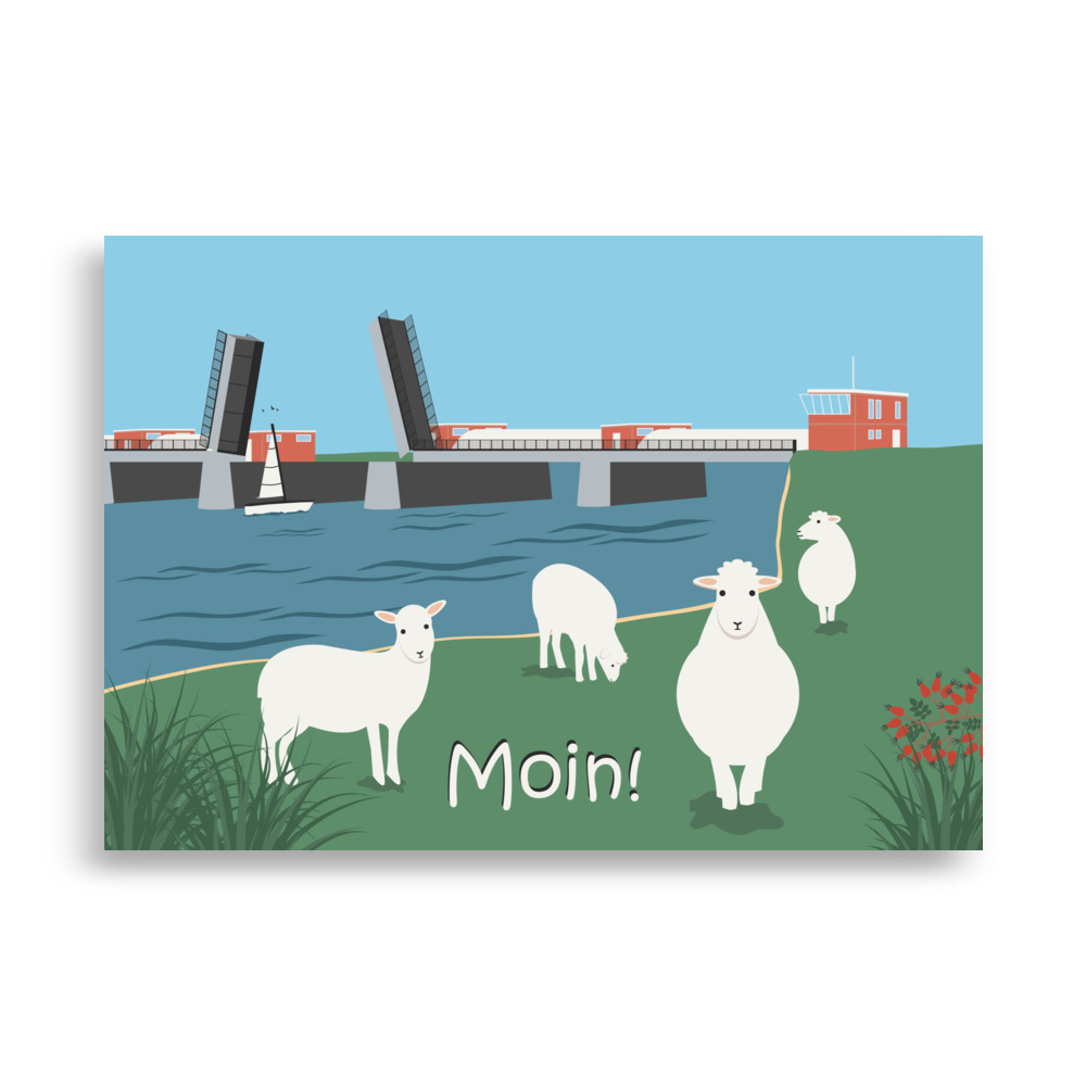 Außer vier entzückenden Schafen sehen wir auf diesem Poster das Oste-Sperrwerk. Es liegt ganz in der Nähe vom Elberadweg zwischen Balje und Neuhaus. Weil hier Schiffe Vorfahrt haben, ist die Klappbrücke meist oben – also offen. Für alle auf zwei Beinen oder zwei bis vier Rädern heißt das: einmal anhalten, tief durchatmen und den Schafen beim Mümmeln zuschauen.