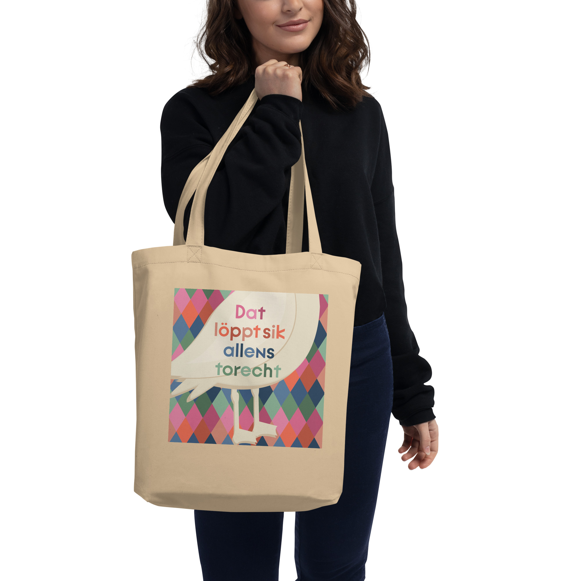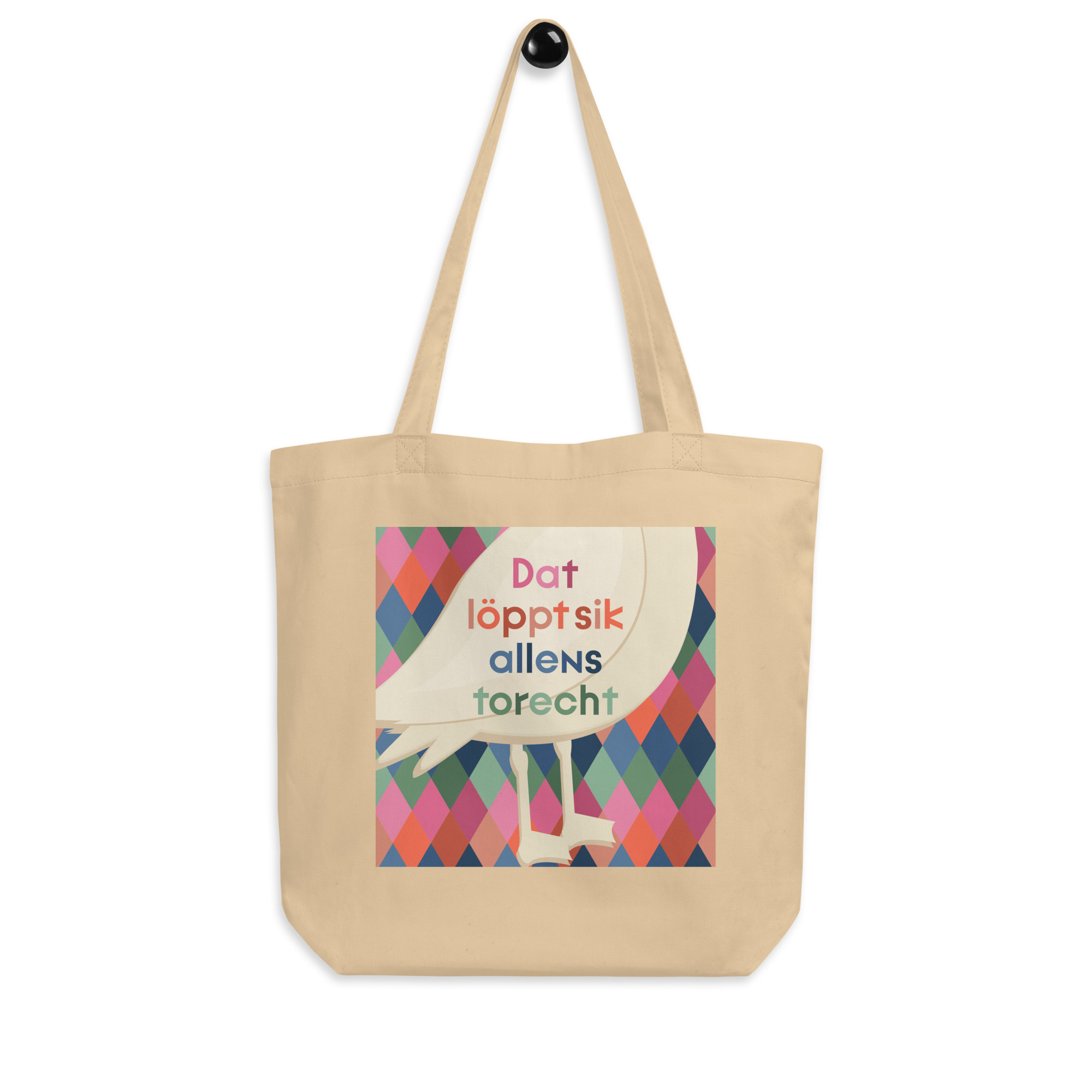 Der Stoffbeutel „Dat löppt“ vereint norddeutschen Charme mit praktischem Nutzen. Der plattdeutsche Spruch „Dat löppt sik allens torecht“ (Das läuft sich schon zurecht/ das wird schon) wird von einem cremefarbenen Möwenmotiv (mit Füßen) begleitet – gedruckt auf einem farbenfrohen Rautenmuster (Pink, Orange, Blau oder Grün).